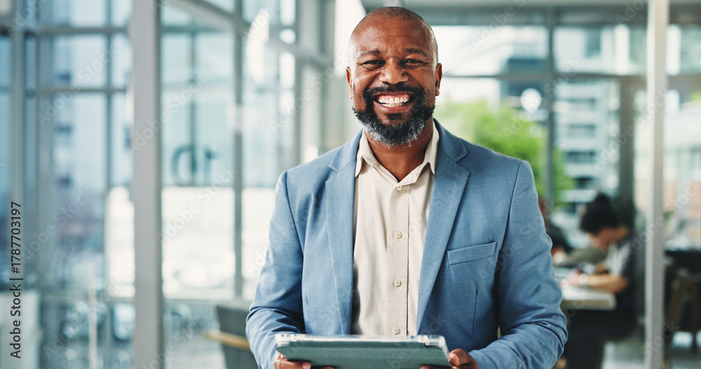 Fototapeta Tablet, smile and portrait of business man in office for financial career, pride and about us