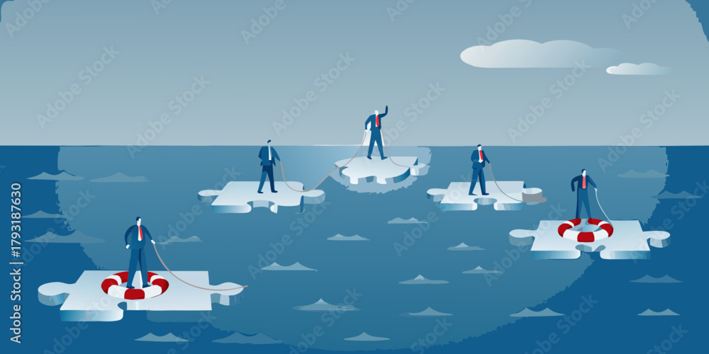 Fototapeta Businessmen on puzzle pieces in the ocean helping each other with ropes and life