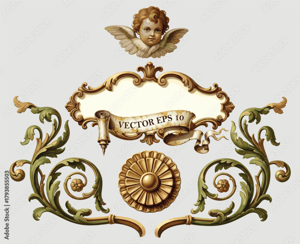 Fototapeta Elegant vintage ornament set featuring cherub head, floral scrollwork, blank frame banner, and classical decorative elements