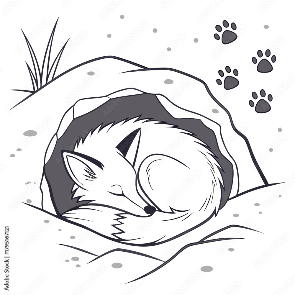 Fototapeta Cute cartoon fox curled up sleeping peacefully inside a cozy den with paw prints