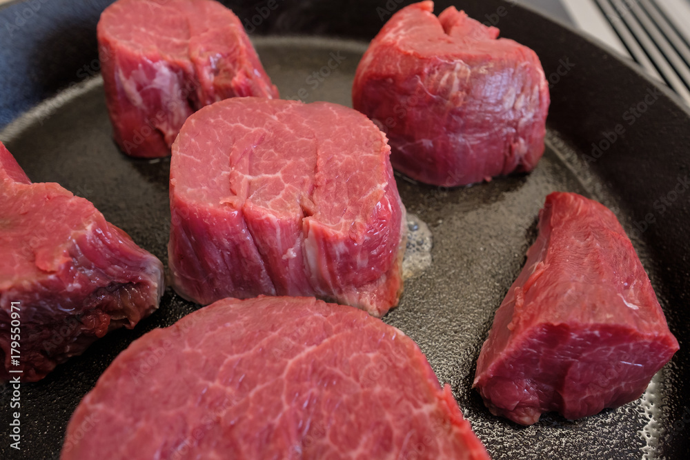 Fotografie Rindfleisch Filet in Bratpfanne aus Gußeisen
