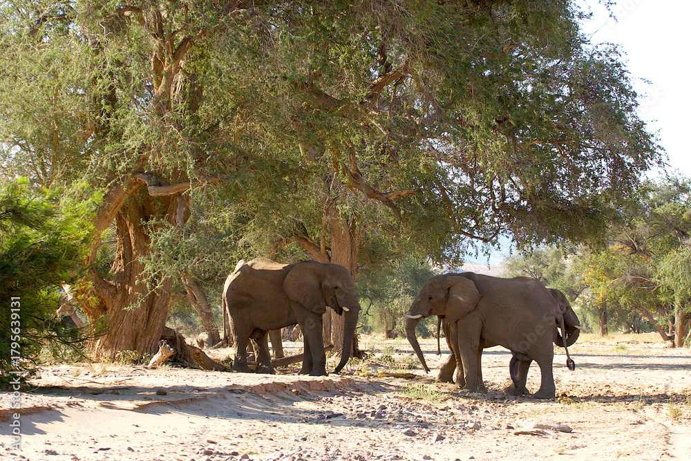 Fototapeta desert elephants in dry riverbed looking for seeds under huge ana trees 245