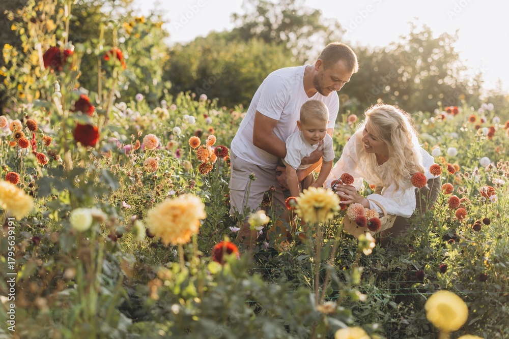 Fototapeta Family picking dahlias in summer flower garden