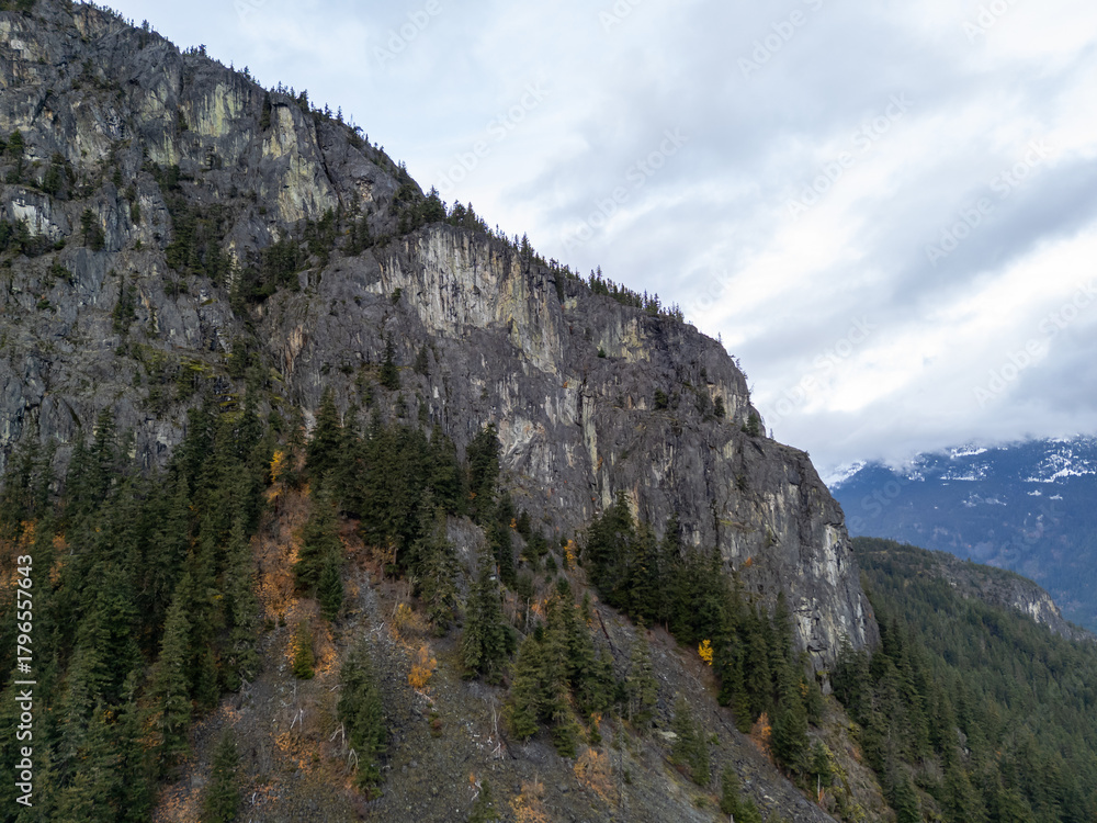 Fototapeta Dramatic Rocky Mountain Cliff With Forested Slopes Above Snow-Capped Peaks in BC