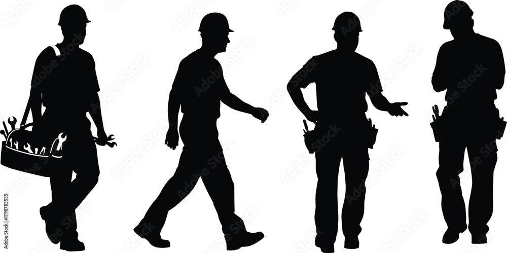 Fototapeta Silhouette construction workers with tools, industrial labor team illustration,
