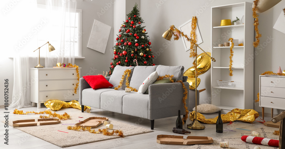 Fototapeta Interior of messy living room with sofa and tinsel after New Year party