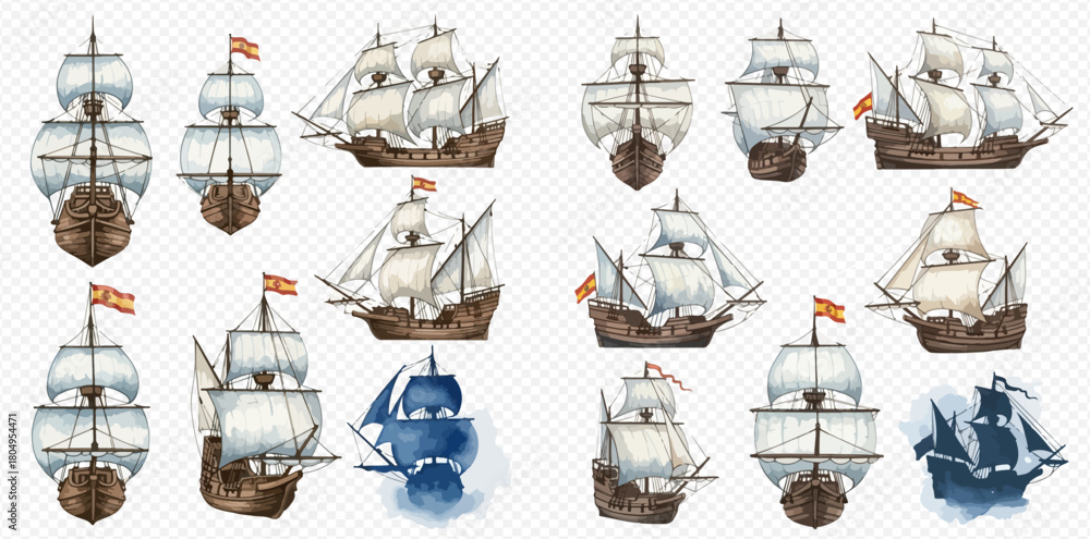 Fototapeta Watercolor collection of vintage sailing ships and galleons from different perspectives, featuring historical vessels with white sails and brown hulls