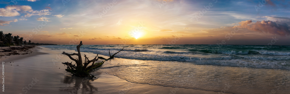 Fototapeta Panorama des Strandes von Tulum, Karibik, Mexiko, bei Sonnenuntergang