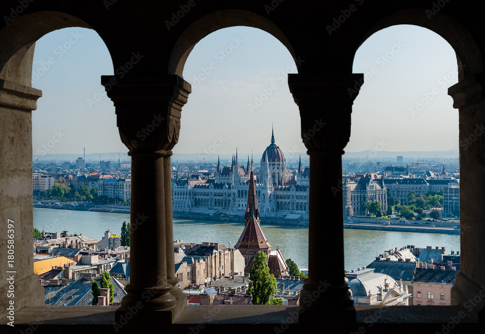Fototapeta Budapest and hungarian parliament view through the arch of fisherman's bastion -