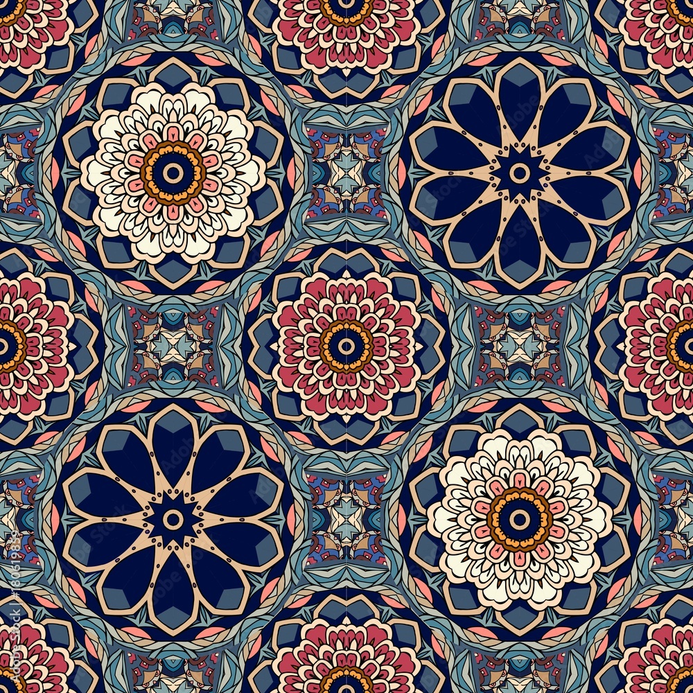 Fototapeta Seamless geometric pattern with stylized lotus and flowers mandalas