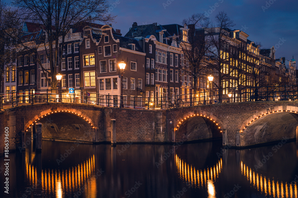 Fototapeta Old historic houses, canal, and a bridge during twilight blue hour, Amsterdam, N