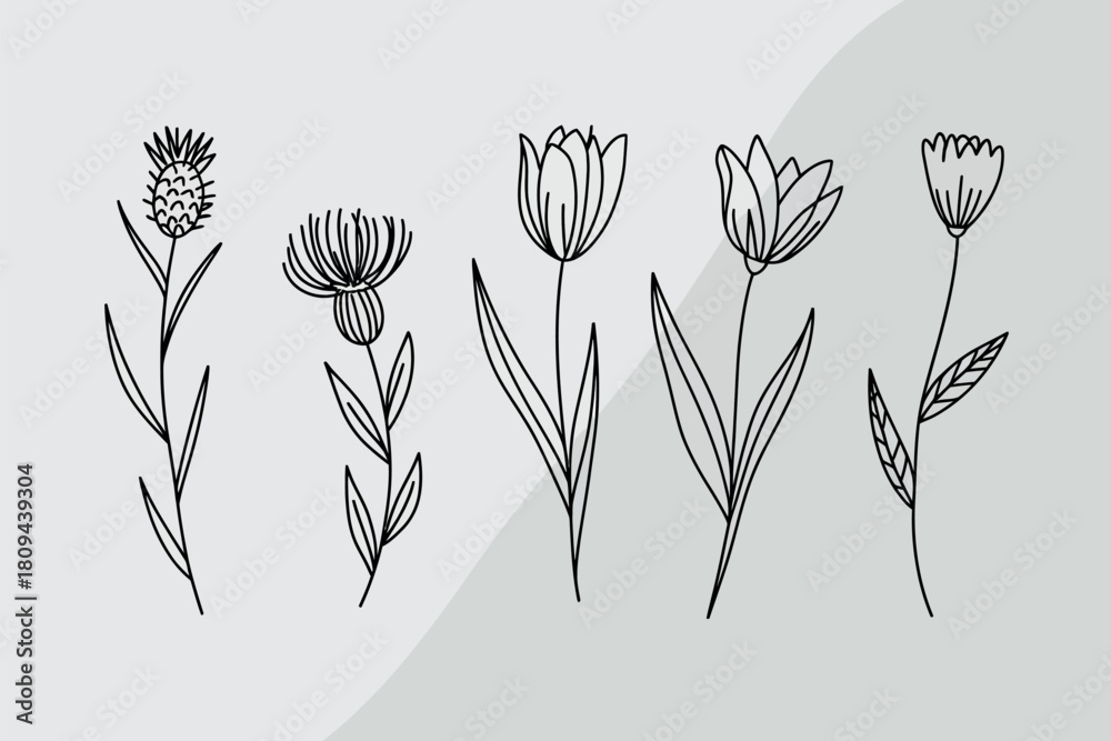Fototapeta Hand drawn botanical illustrations of thistles and tulips
