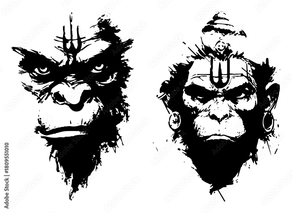 Fototapeta Lord Hanuman And Angry Ape Head Vector Illustration In Distressed Grunge Dry Bru