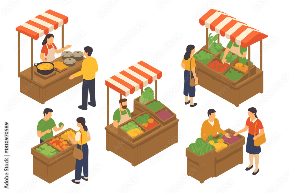 Fototapeta Isometric street market stalls with vendors selling fresh produce and prepared f