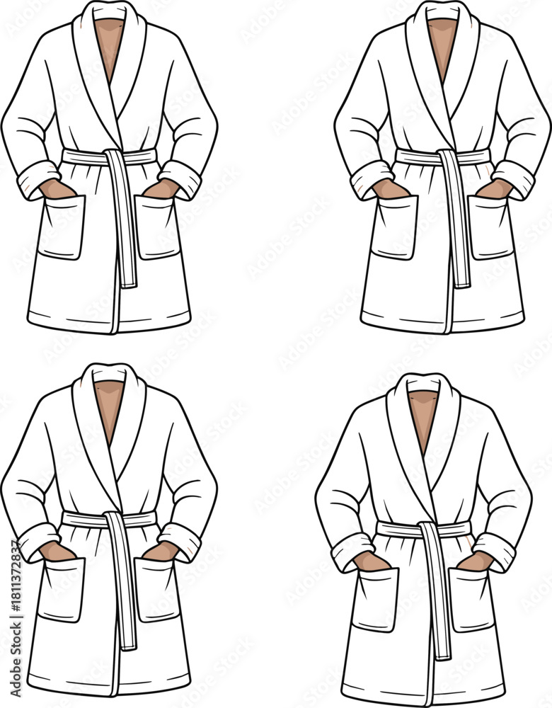Fototapeta Vector fashion flat sketch set of cozy belted bathrobes with pockets and shawl collars showing multiple front design variations for loungewear