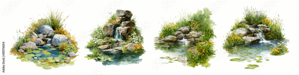 Fototapeta Watercolor set of garden lakes with mini waterfalls