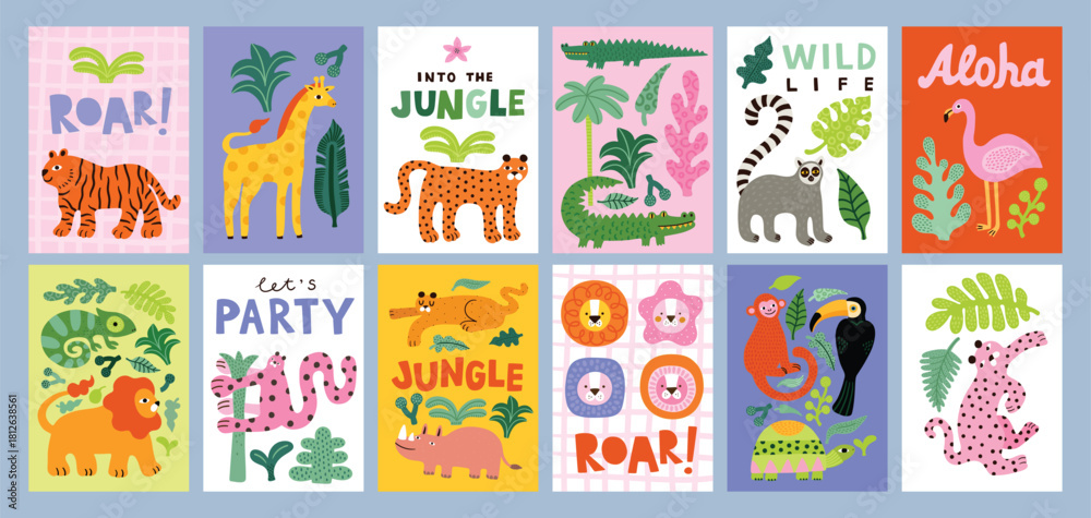 Fototapeta Childish tropical jungle poster with cute lion, tiger, crocodile, giraffe, leopard, toucan, turtle, flamingo, lemur, rhino, leaves