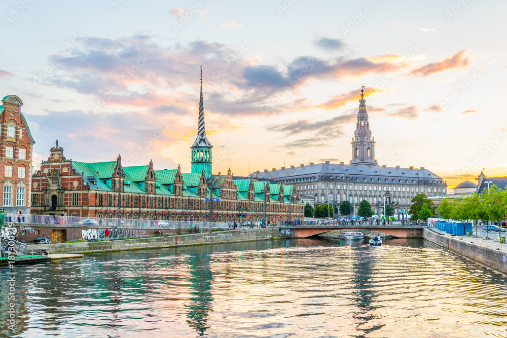 Fototapeta Sunset view of the Borsen and Christiansborg slot palace in Slotsholmen, in Cope