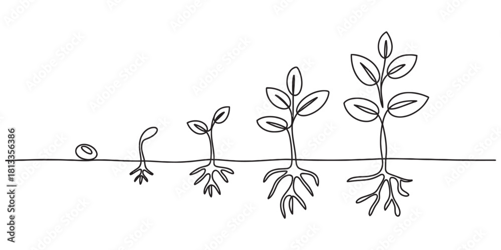 Fototapeta Continuous line art drawing of plant growth stages, from seed germination to sprouting seedling with roots and leaves, growing process