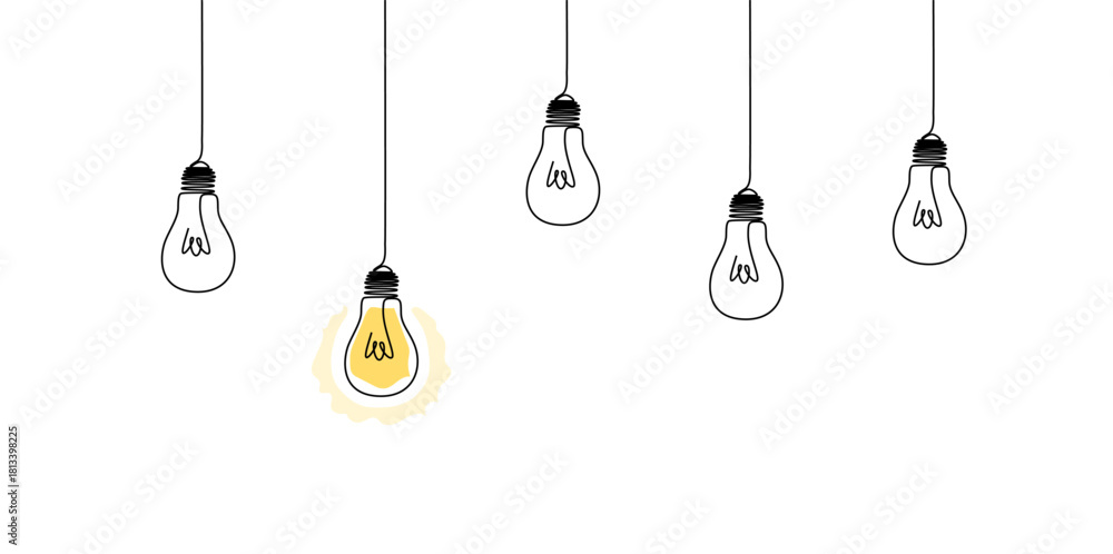 Fototapeta One continuous line drawing of hanging light bulbs with one shining