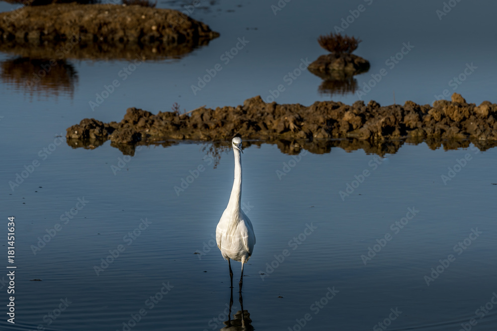 Fototapeta white egret strolls through the swamp in the ornithological reserve near Bordeau