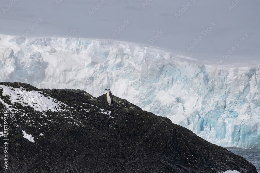 Fototapeta One lone chinstrap penguin in front of a towering glacier in Antarctica
