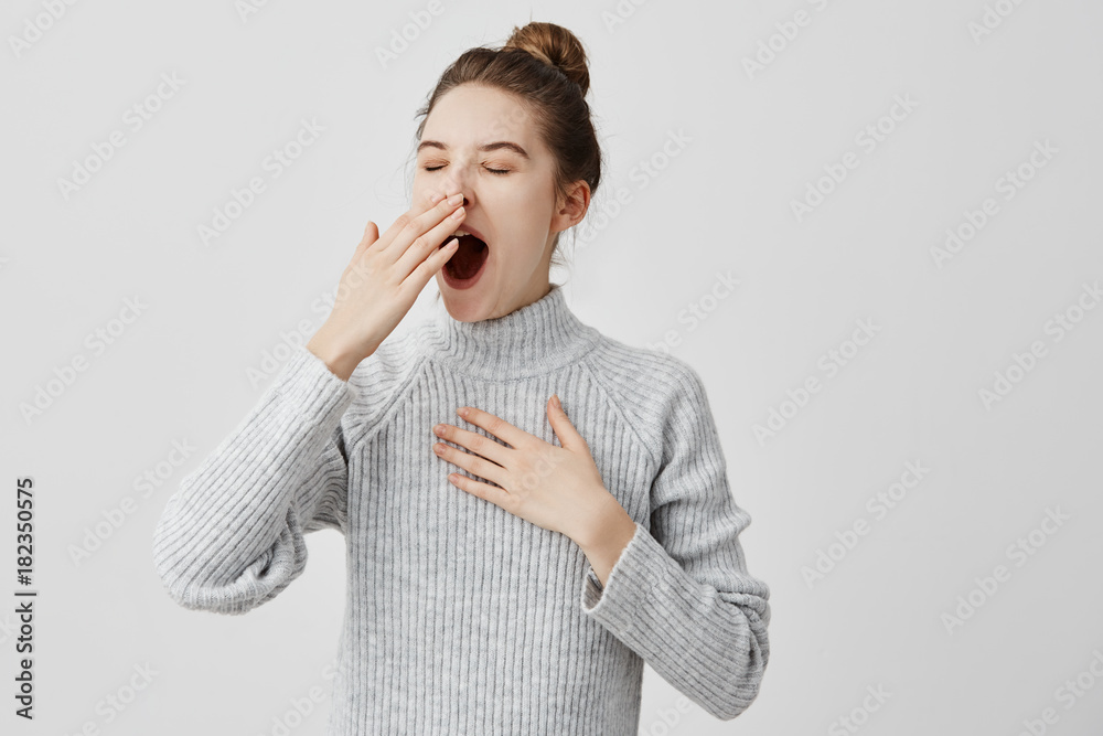 Fototapeta Tired woman yawning covering open mouth with hand need rest