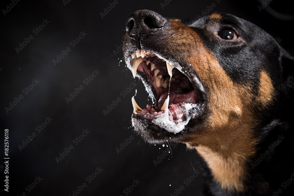 Fototapeta Ferocious Rottweiler barking mad on black background.