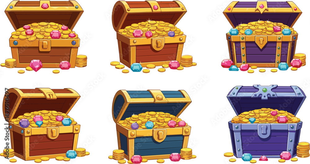 Fototapeta Cartoon treasure chests filled with gold coins and colorful gems, fantasy loot c
