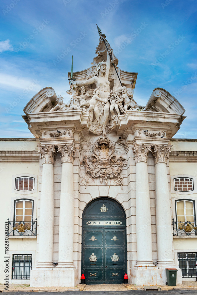 Fototapeta The Military Museum’s facade with the sculpture in the main entrance featuring an allegorical group representing The Fatherland, by Teixeira Lopes, flanked by Corinthian columns, Lisbon, 2023