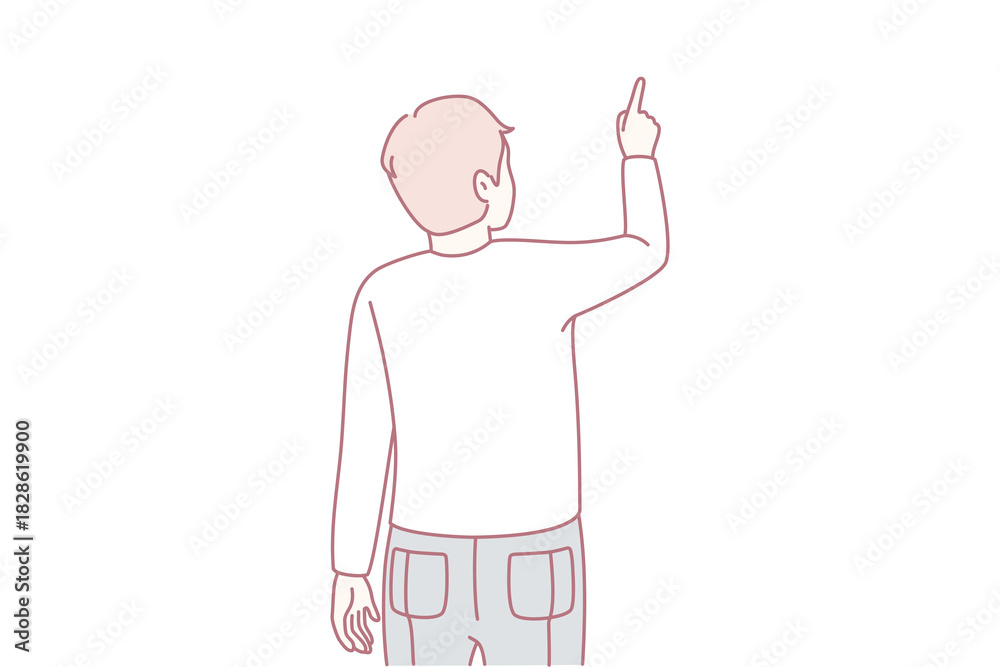 Fototapeta Man standing pointing at wall, gesturing toward imagined chart, assertive postur