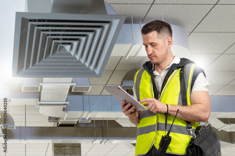 Fototapeta HVAC inspection technician reviews airflow system data on a tablet, checking ventilation ducts and ensuring proper operation in a commercial building