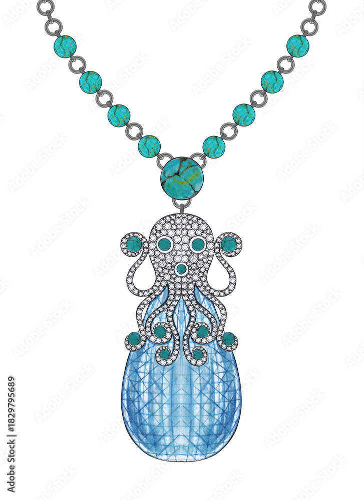 Fototapeta Octopus necklace with blue topaz diamond and turquoise jewelry design by hand drawn