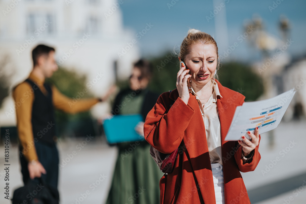 Fototapeta A businesswoman in a red coat speaks on her cellphone while examining a document; blurred coworkers and city bustle suggest a busy urban workday