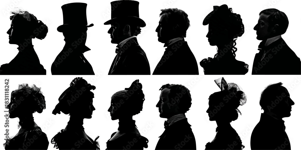 Fototapeta Collection of diverse historical silhouette portraits featuring men and women in
