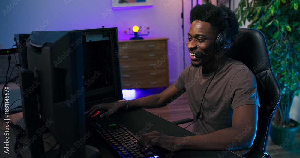 Fototapeta A male gamer immersed in a multiplayer game talks and jokes with teammates through his headset, controlling his character with backlit keyboard and mouse