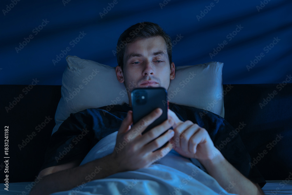 Fototapeta A tired man lies awake in a dark bedroom, staring at his glowing smartphone and doom scrolling late at night despite his growing fatigue