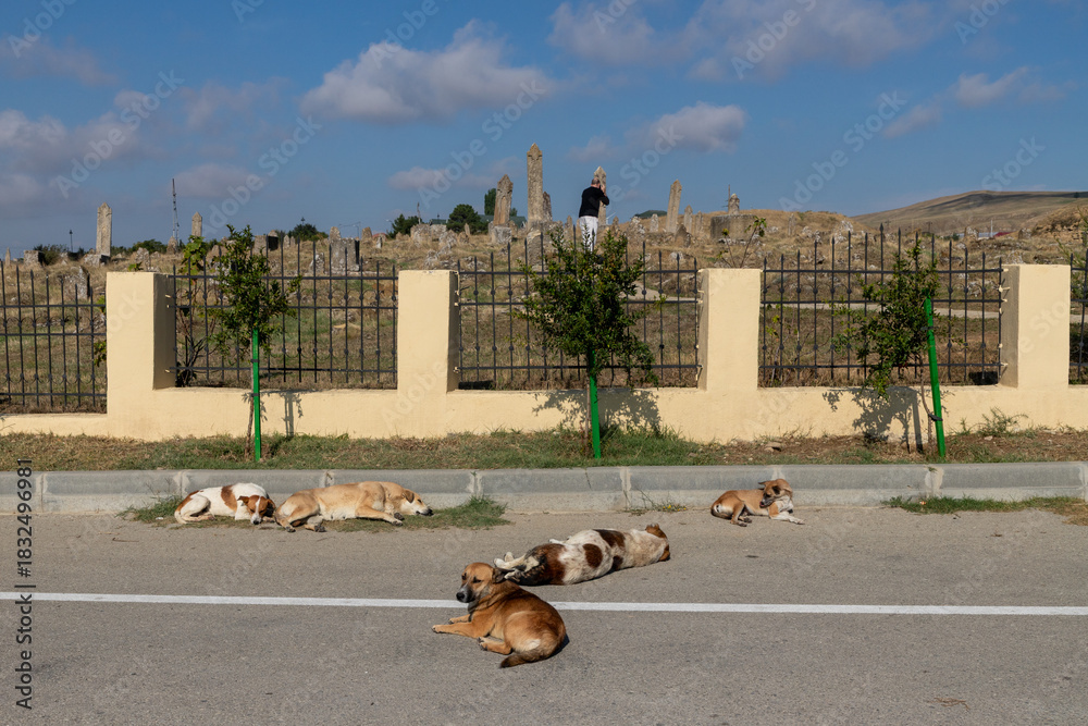 Fototapeta Graveyard dogs dozing in the summer sun outside a graveyard at Maraza, Azerbaija