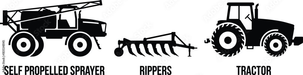Fototapeta Agricultural machinery silhouettes, self propelled sprayer, rippers, tractor, fa