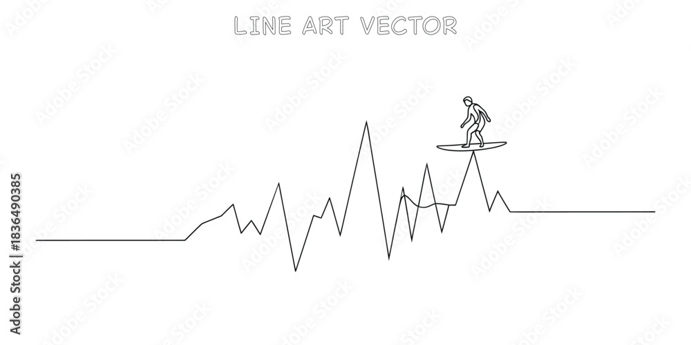 Fototapeta Continuous one line drawing of surfer riding on financial graph wave illustratin