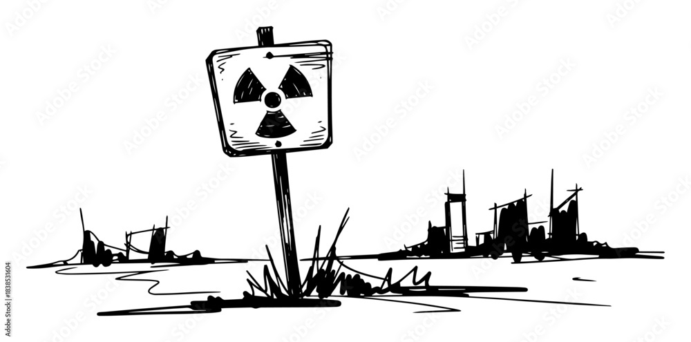 Fototapeta radiation warning sign in a post-apocalyptic ruined city