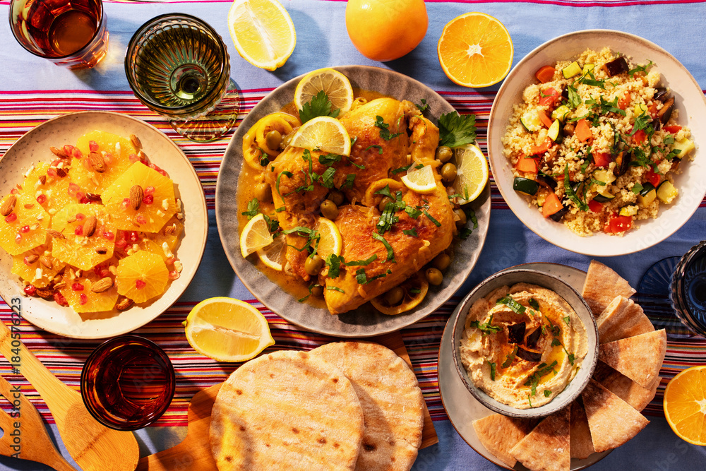 Fototapeta Moroccan feast with chicken tagine, vegetable couscous, orange salad, and eggpla