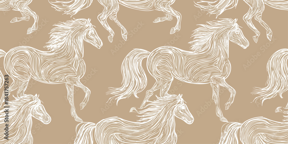 Fototapeta Artistic repeating pattern of flowing line-art horses in white on a warm, neutra