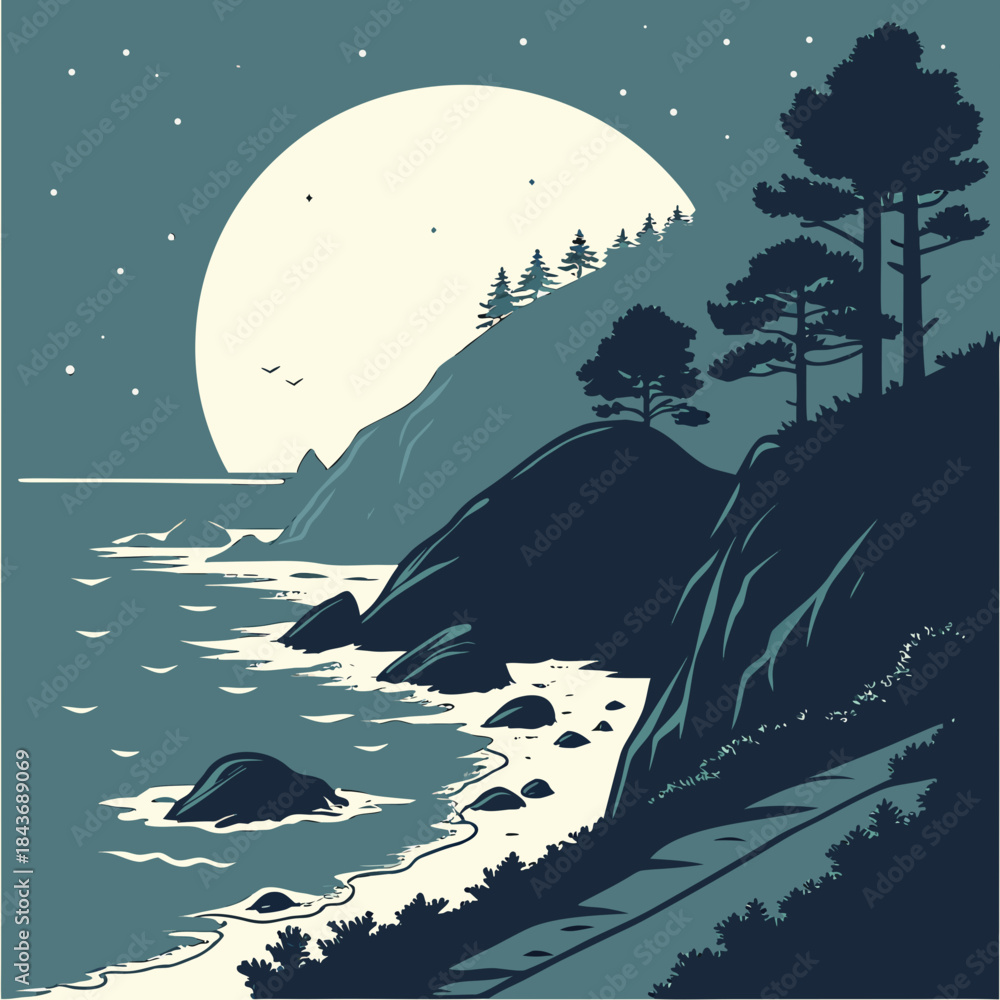 Fototapeta Serene coastal landscape under a large full moon with silhouetted pine trees on