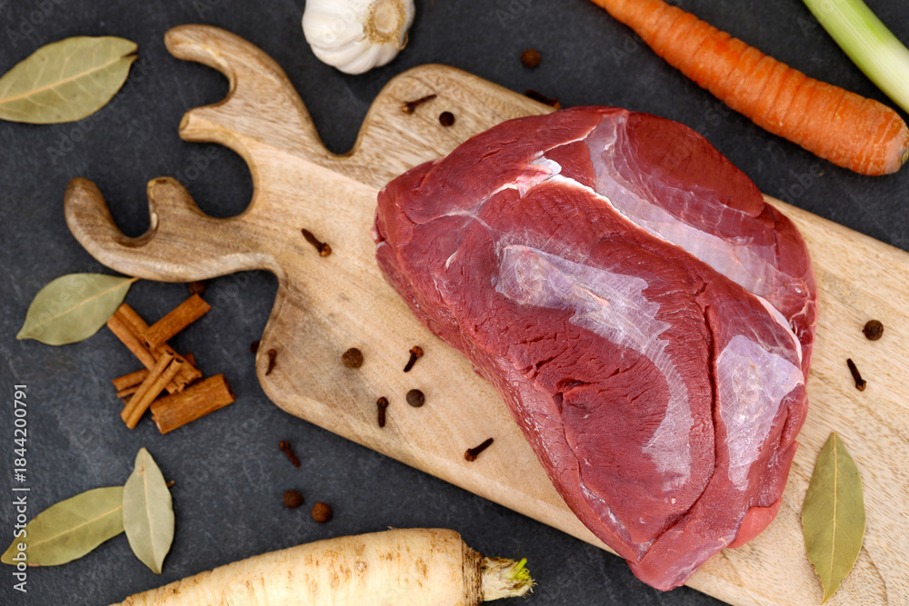 Fototapeta top view of raw venison haunch on wooden board with spices and vegetables, ingre