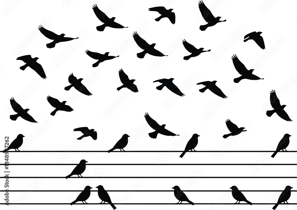 Fototapeta Set of Black Bird Silhouettes Flying in the Sky and Sitting on Power Lines Isola