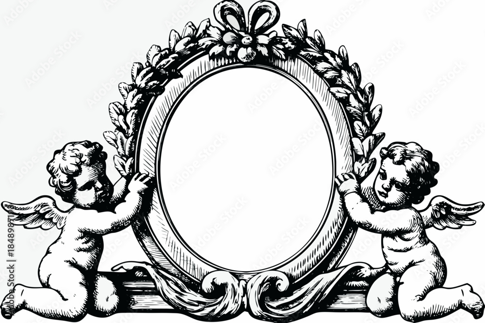 Fototapeta Vintage ornate frame with cherubs and floral decorations black and white illustr