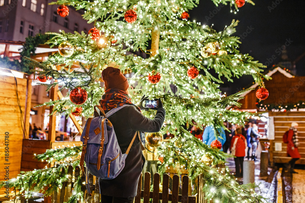 Fototapeta Woman tourist at night admiring the Christmas tree with lights in the main squar