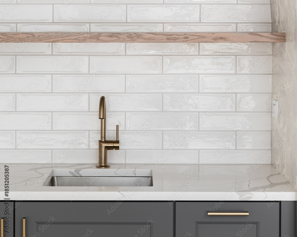 Fototapeta A modern kitchen sink detail with a brass faucet against a white subway tile backsplash, floating natural wood shelf, dark gray cabinets, and pattern wallpaper