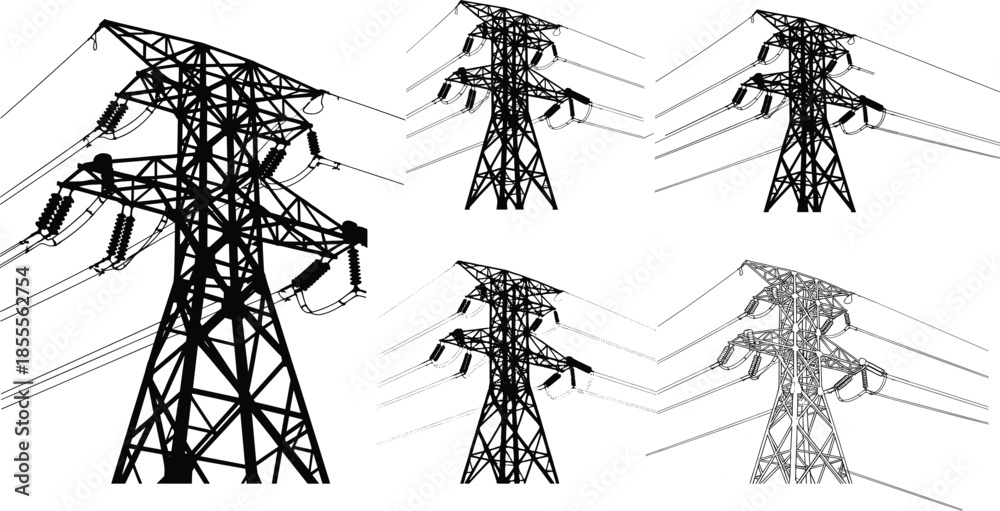 Fototapeta High voltage power transmission tower illustration set, electrical grid infrastr